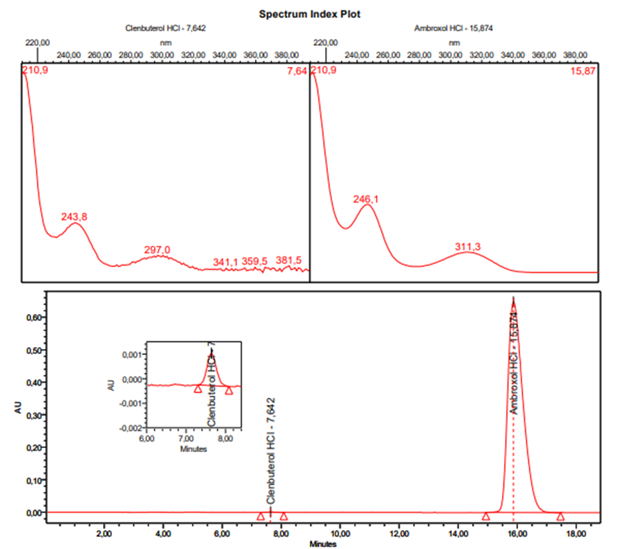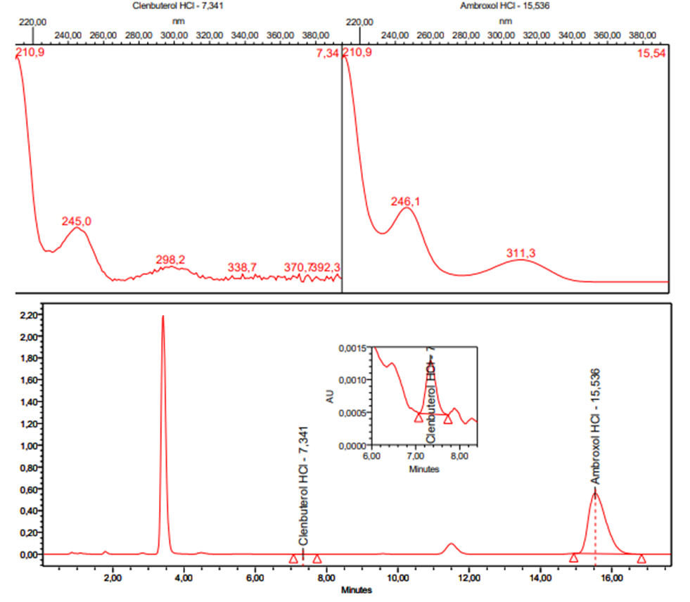 En la figura 3 y figura 4 se presentan los espectros de absorción UV y cromatogramas correspondientes al estándar combinado y muestra, respectivamente. Se pueden observar las señales cromatográficas correspondientes a ambroxol y clembuterol. En ambos cromatogramas se puede evidenciar que no existen interferencias.