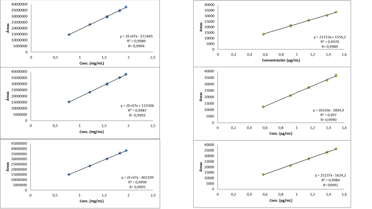 Las curvas de calibración obtenidas demuestran que el método es lineal, ya que existe proporcionalidad entre las áreas y la concentración de ambos analitos en diferentes días de estudio, presentando valores de R ≥ 0,999 que cumplen con los criterios de aceptación establecidos en la USP e ICH. Adicionalmente, el coeficiente de determinación (R²) aporta una mayor significación estadística, por ser R² un parámetro de mejor ajuste (14).
