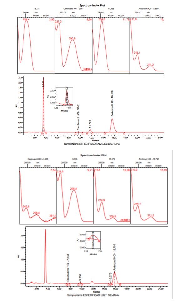 El método es específico, al permitir reconocer inequívocamente la presencia de ambroxol y clembuterol, discriminando la presencia de sustancias contaminantes.