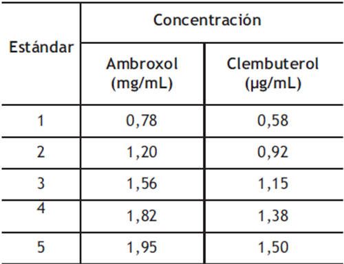 Linealidad: El estudio de la linealidad del método se basó en la construcción de curvas de calibración. Estas fueron realizadas en días diferentes a partir de cinco niveles de concentración correspondientes a 50, 80, 100, 120 y 130% del valor de referencia de acuerdo a la concentración del fármaco, tanto para el ambroxol como para el clembuterol. Estas disoluciones se prepararon a partir de los correspondientes estándares de referencia y los porcentajes están expresados en términos de niveles con respecto al 100% de la curva de calibración, como especifica la USP. Los cinco niveles de concentración mencionados abarcan desde 0,78 mg/mL hasta 1,95 mg/mL para el ambroxol y desde 0,576 µg/mL hasta 1,4976 µg/mL para el clembuterol en la fase móvil. Finalmente, se inyectó en el cromatógrafo cada estándar por duplicado. Se calculó la ecuación de regresión lineal para cada analito y se hicieron sus curvas de calibración al graficar el área de la señal cromatográfica frente a la concentración del analito correspondiente, así como los coeficientes de variación de los factores de respuesta.
