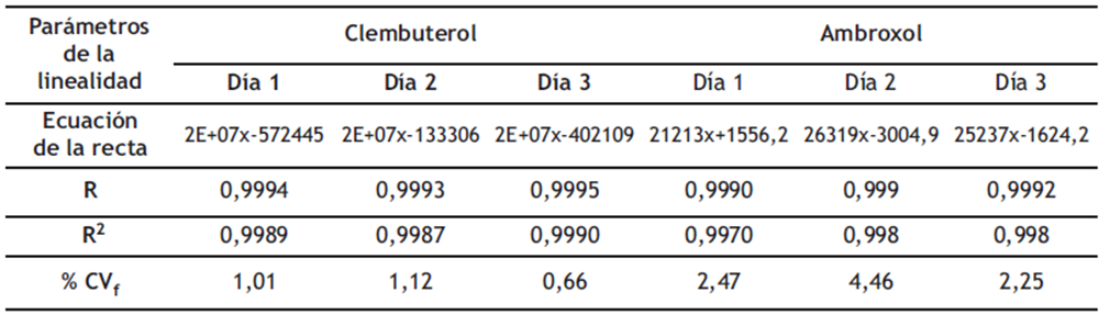 La linealidad no se vio afectada por la variabilidad de las condiciones ambientales del estudio en diferentes días, ya que, en las curvas de calibración en los distintos días, tanto para el ambroxol como para el clembuterol, se obtuvo un %CVf menor al 5 %, indicando que existe una correlación lineal significativa entre las áreas obtenidas y la concentración de los analitos.