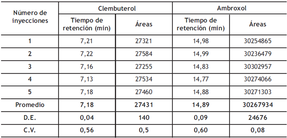 Para el estudio de la precisión del sistema cromatográfico, se realizaron 5 inyecciones de estándar al 100% (1,56 mg/mL de ambroxol y 1,15 μg/mL de clembuterol); posteriormente, se determinó el promedio del área bajo la curva de las señales cromatográficas obtenidas y el tiempo de retención, y se calcularon los coeficientes de variación (CV) utilizando la (ecuación 1).