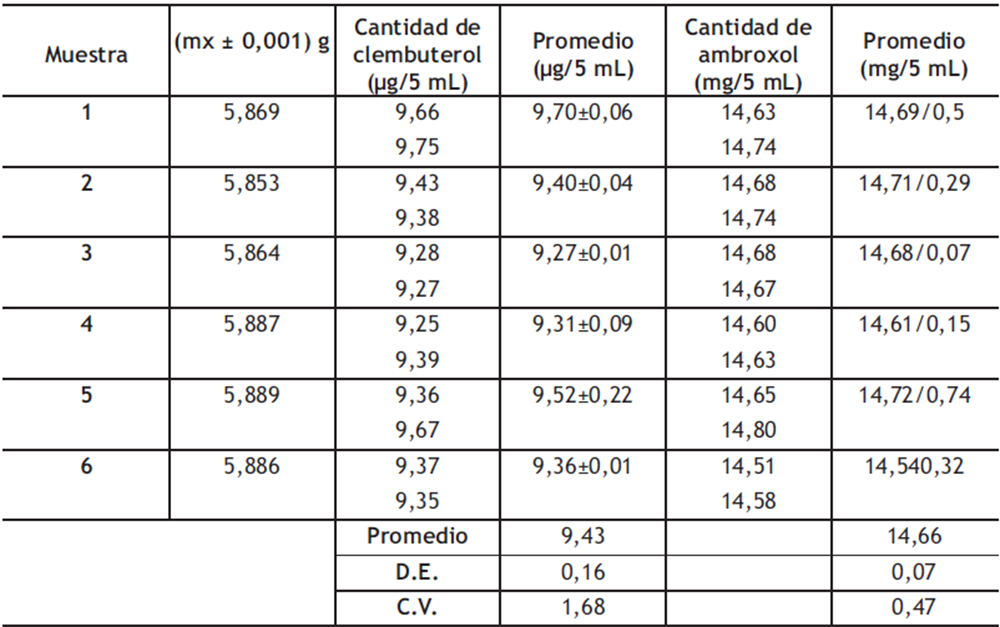 El método analítico validado para la determinación simultánea de ambroxol y clembuterol presentó una serie de ventajas con respecto a lo reportado en la literatura, siendo una de las más importantes el hecho de poder analizar de manera simultánea el ambroxol y el clembuterol en un jarabe; a pesar de la baja concentración de este último, se encontró que el método posee un excelente límite de detección y cuantificación que así lo permite. También es importante señalar que la metodología propuesta utiliza la HPLC con DAD, lo cual resulta sumamente ventajoso en laboratorios farmacéuticos que cuenten con este instrumento. Se estableció que la evaluación de la linealidad en diferentes días demostró que existe una correlación lineal significativa, sin variación entre días, ya que los coeficientes de variación de los factores de respuesta fueron menores al 5%, lo cual permite comprobar la poca variabilidad en la sensibilidad del método, tanto para ambroxol como para clembuterol.                                                                                                                                                                                                                                                          El método cromatográfico desarrollado es preciso, al presentar coeficientes de variación menores al 2% para la precisión del sistema cromatográfico (tanto en los tiempos de retención como en las áreas) y repetibilidad. Al evaluar la repetibilidad y la precisión intermedia, se encontró que el coeficiente de variación de Horwitz es CV del análisis, demostrando que el método es preciso para la cuantificación de ambos principios activos.