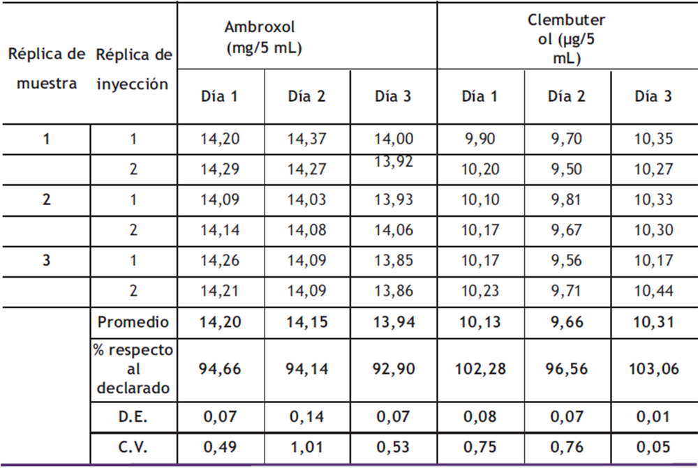 Repetibilidad: Los resultados obtenidos para la repetibilidad del método analítico se muestran en la tabla 4. A partir de las áreas obtenidas con estas muestras y una curva de calibración preparada ese día, se determinó el valor promedio y el coeficiente de variación de la cantidad de ambroxol y clembuterol en el jarabe (mg/mL). Los resultados muestran la repetibilidad del método analítico, ya que el valor del coeficiente de variación fue menor a 2%.