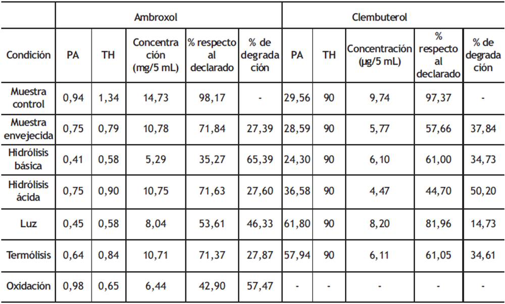 Los resultados de las pruebas de degradación bajo estrés, que se realizaron para evaluar la especificidad del método, también se usaron para determinar el porcentaje de degradación que tuvieron las disoluciones de las muestras en las diferentes condiciones de análisis. Estos resultados proporcionan información sobre el grado de degradación que se da lugar en la muestra bajo condiciones de fotólisis, termólisis, oxidación, hidrólisis ácida e hidrólisis básica. En la tabla 6 se presentan los valores obtenidos de ángulo de pureza y umbral de ruido, así como porcentajes de degradación; se observa una degradación mayor al 20 % con respecto a la concentración inicial de los fármacos, que es lo recomendado por la AEFI para estudiar la estabilidad de las muestras (13).