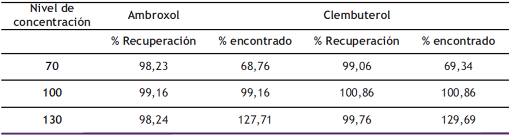 La exactitud medida como porcentaje de recuperación para el ambroxol se encontró entre 68,76% y 127,71% y para el clembuterol entre 69,34% y 129,69% para niveles de concentración fortificados entre el 70% y 130%, resultados que se encuentran dentro de los límites del criterio de aceptación comprendido entre 98,0% y 102,0% para cada nivel, según lo establecido en la ICH.