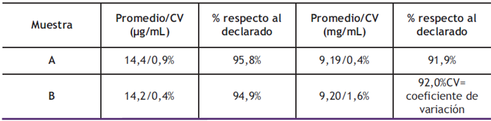 Aplicación del método propuesto para la determinación simultánea de ambroxol y clembuterol en jarabe: Una vez validada la metodología analítica para la determinación simultánea del ambroxol y clembuterol, se procedió a analizar dos medicamentos, de la misma marca comercial, pero diferentes lotes y vigentes para el momento de la investigación. Una vez culminadas las pruebas, se llevaron a volumen empleando fase móvil. Las muestras fueron tratadas por separado, según la metodología propuesta, y se determinaron las cantidades de ambroxol y clembuterol CV (%) y porcentaje con respecto a lo declarado (ecuación 6).
