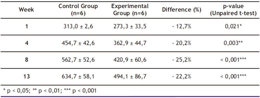 Unpaired Student’s *t*-test: Intergroup comparisons per week.