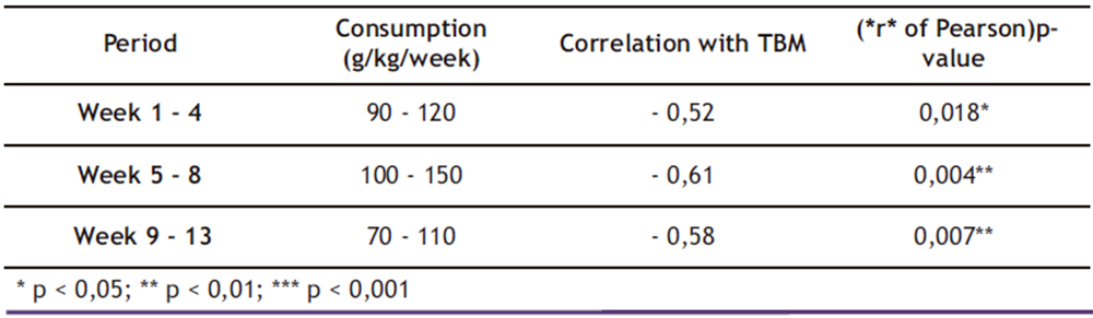 A robust negative correlation (r = − 0.73; p < 0.001) was identified between cumulative ethanol intake and TBM, with a critical inflection point at Week 6, coinciding with the onset of hepatic alterations documented in other studies (27). Animals exceeding 500 g/kg cumulative intake exhibited accelerated TBM loss, mirroring patterns observed in humans with alcohol use disorder [AUD] (14).