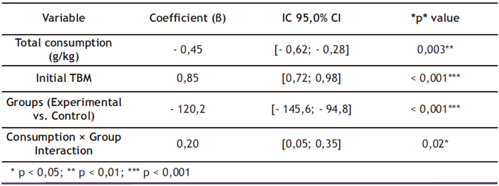 Detection of a significant Consumption × Group interaction (β = 0.20; p = 0.02), implying metabolic adaptation mechanisms wherein animals with higher initial intake exhibited attenuated subsequent weight loss.